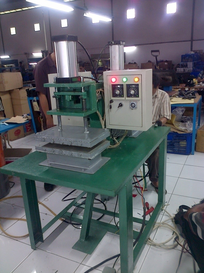 Spesifikasi: -> Ukuran Mesin P x L x T = 130 Cm x 80 Cm x 145 Cm.-> Material Rangka dari besi kanal UNP.-> Double Head (Dua orang Pekerja).-> Electric Power 10.000 Watt.-> Stick Heater inside on Alumunium Block.-> Double Electric Box.-> Pneumatics Pressed.-> Electro Pneumatics System.-> Thermo Control / Pengatur Suhu.